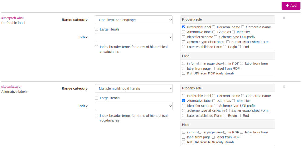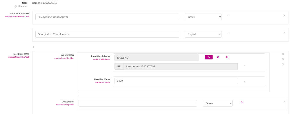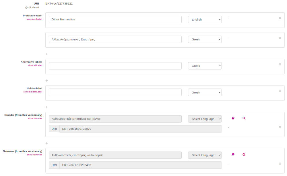 The novelty of Semantics.gr lies in the fact that, besides SKOS, it can support any Data Model that can be expressed as an OWL ontology. The Data Model chosen in each case generates the template based on which a Vocabulary Schema is created. The Vocabulary Schema in turn, stipulates in detail the structure of the vocabulary that will be created in the infrastructure. In practice, the Vocabulary Schema defines in detail the entry/update form through which the user adds or updates Semantic Resources.