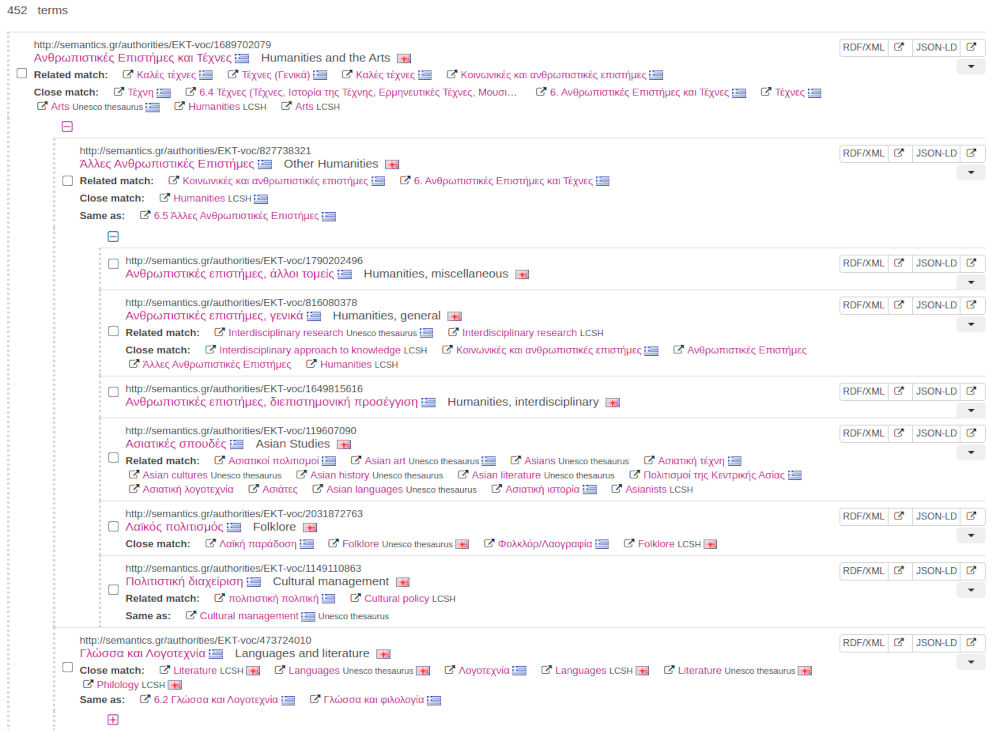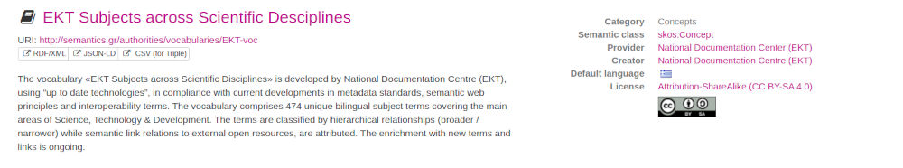 Semantics.gr started to be developed, in-house, in 2015, by EKT staff. The initial aim was to serve as a platform for hosting the vocabularies that EKT’s scientific staff was developing and using in the documentation and enrichment process of the content services it offers (National PHD Archive, Institutional Repository, etc).