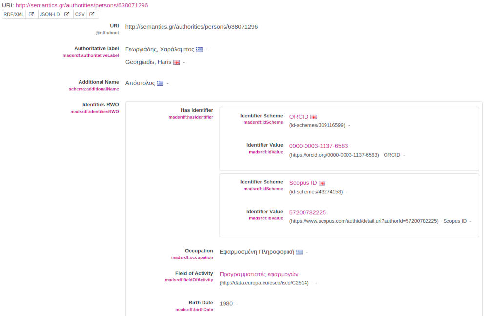 A MADS/RDF PersonalName presentation page of a semantic resource